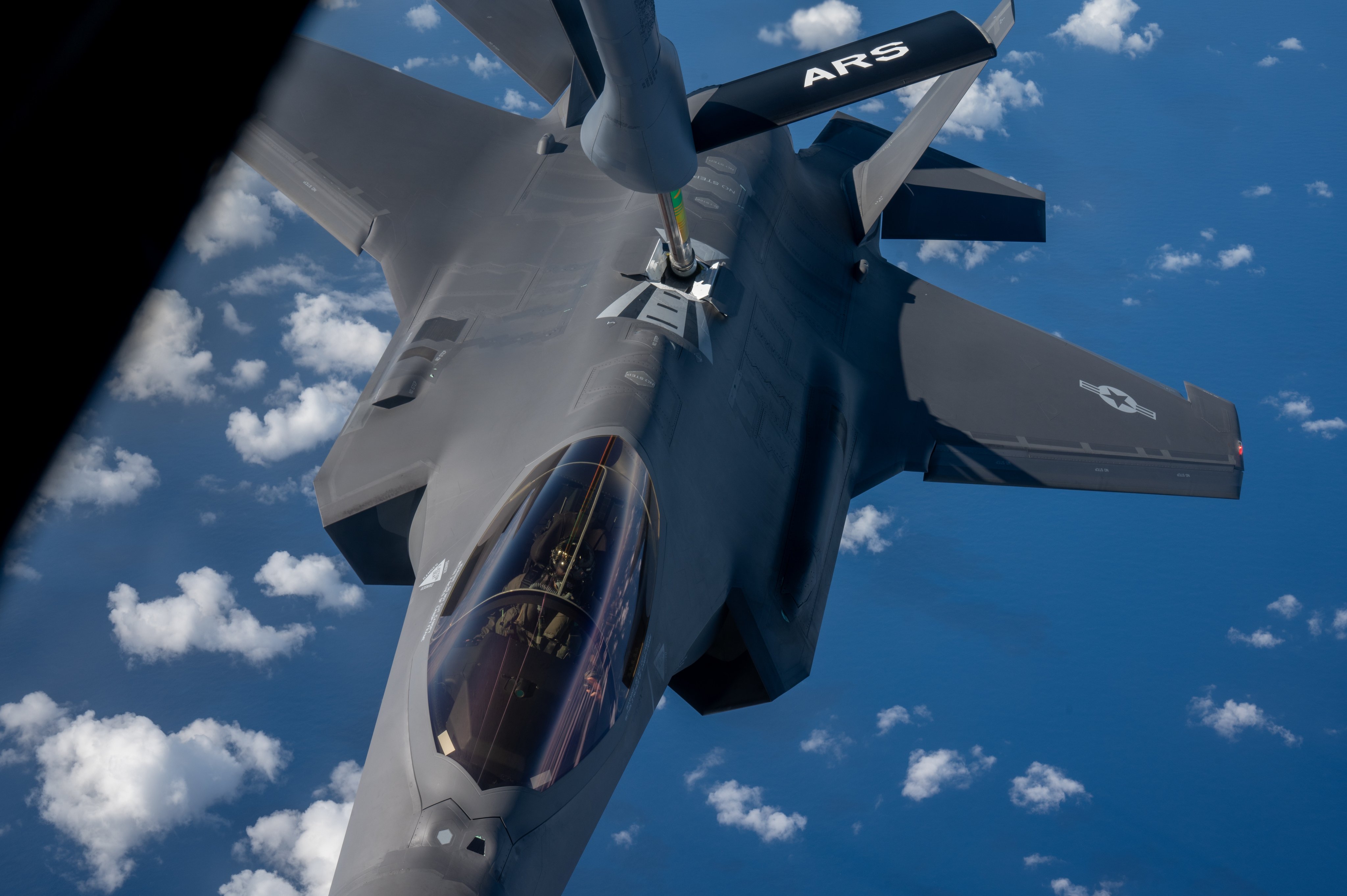 Amerykański myśliwiec 5. generacji F-35A w czasie powietrznego tankowania z samoloty KC-135. Nawet Amerykanie nie produkują swoich maszyn w całości na terenie USA.