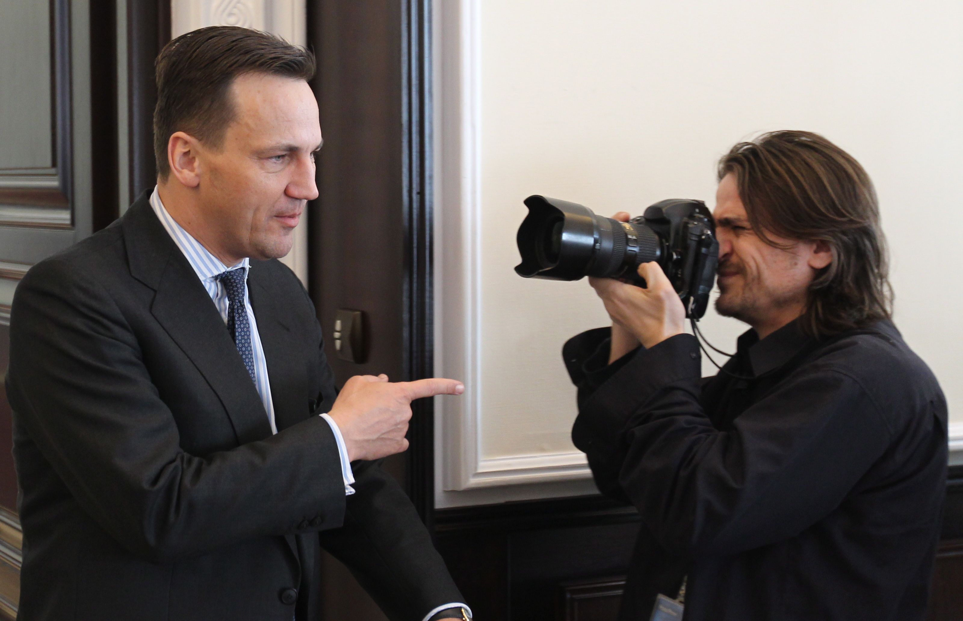 Marzec 2011. Adam Chełstowski fotografuje Radosława Sikorskiego. (fot. Radek Pietruszka / PAP)