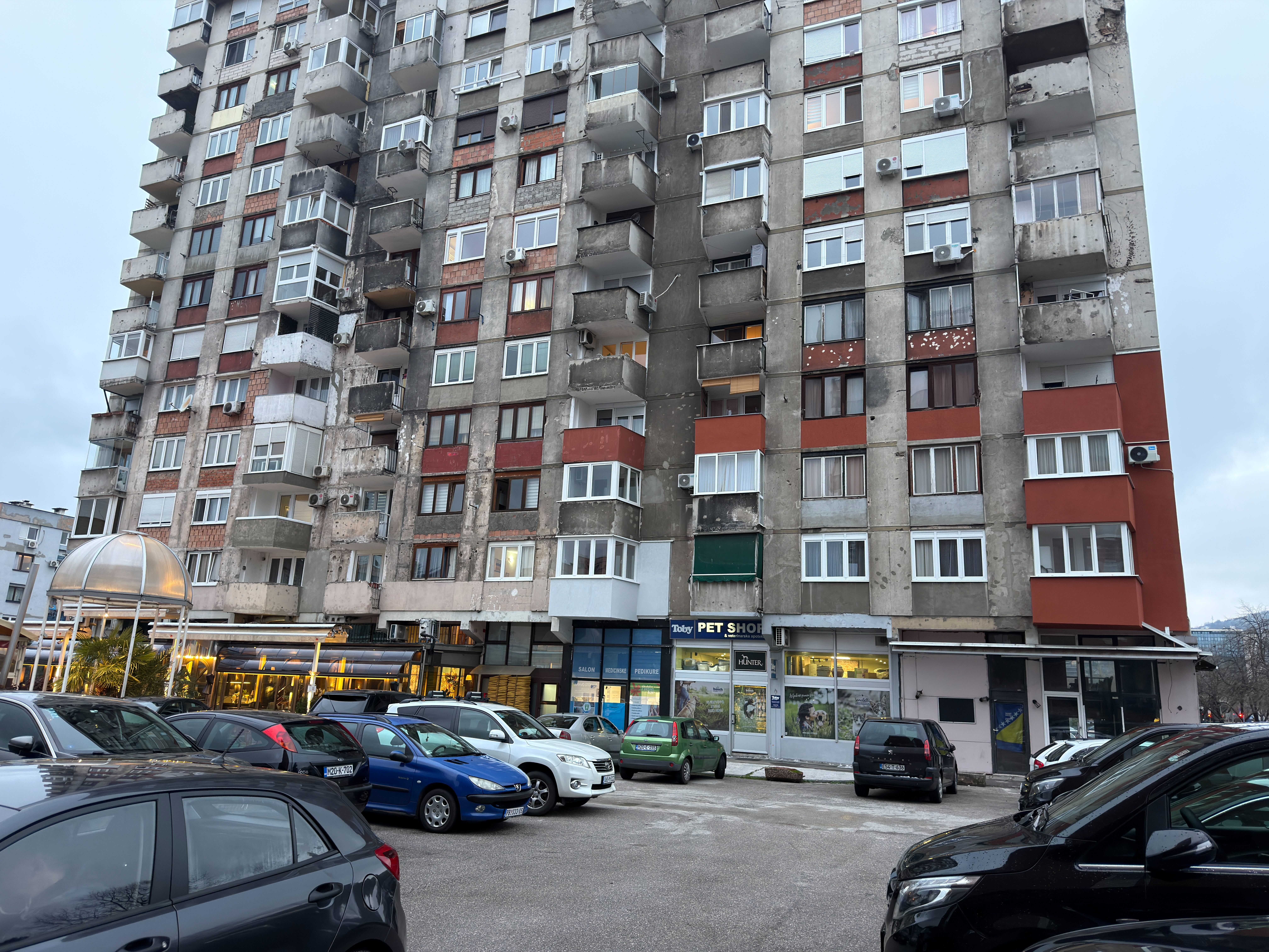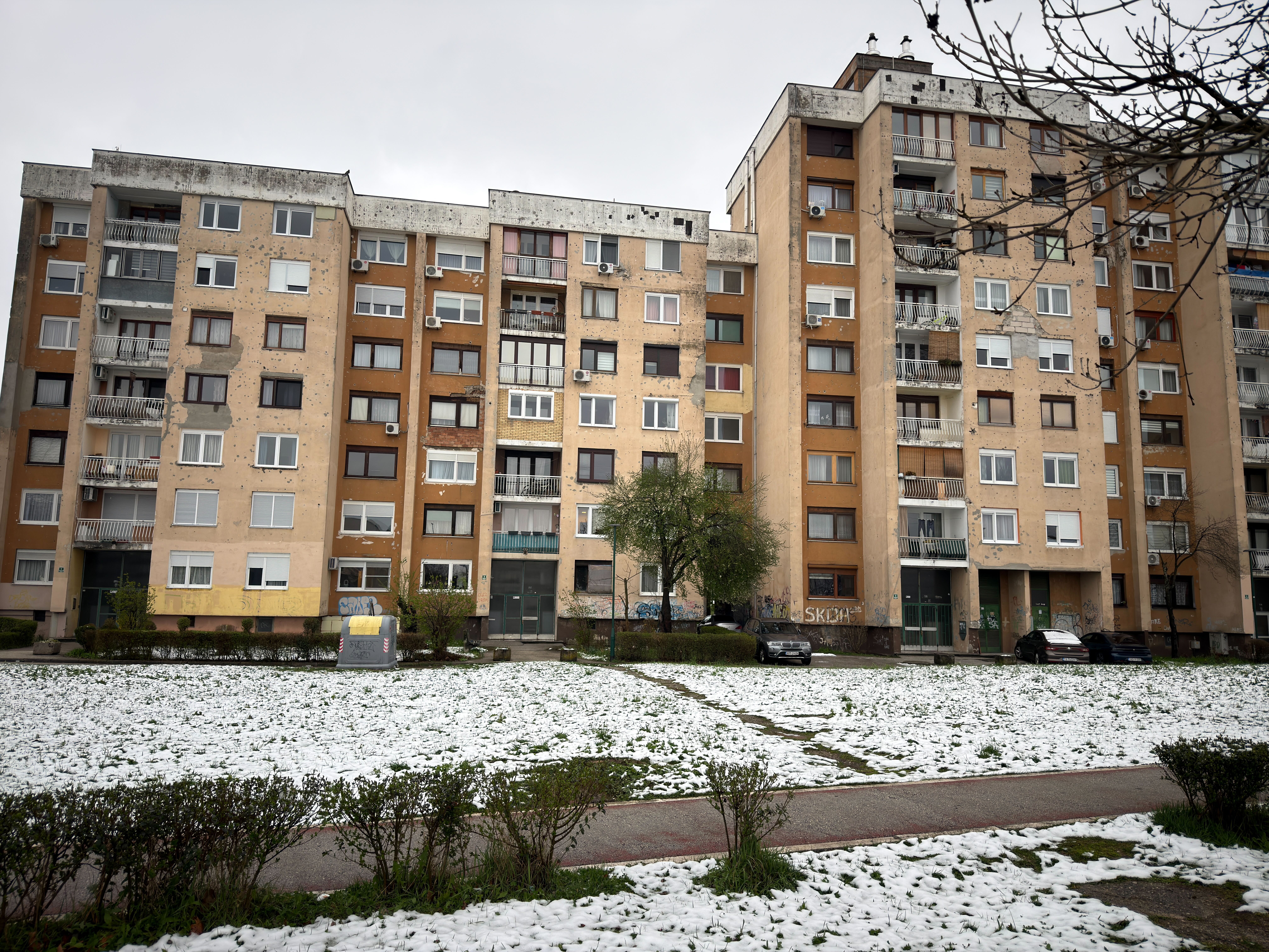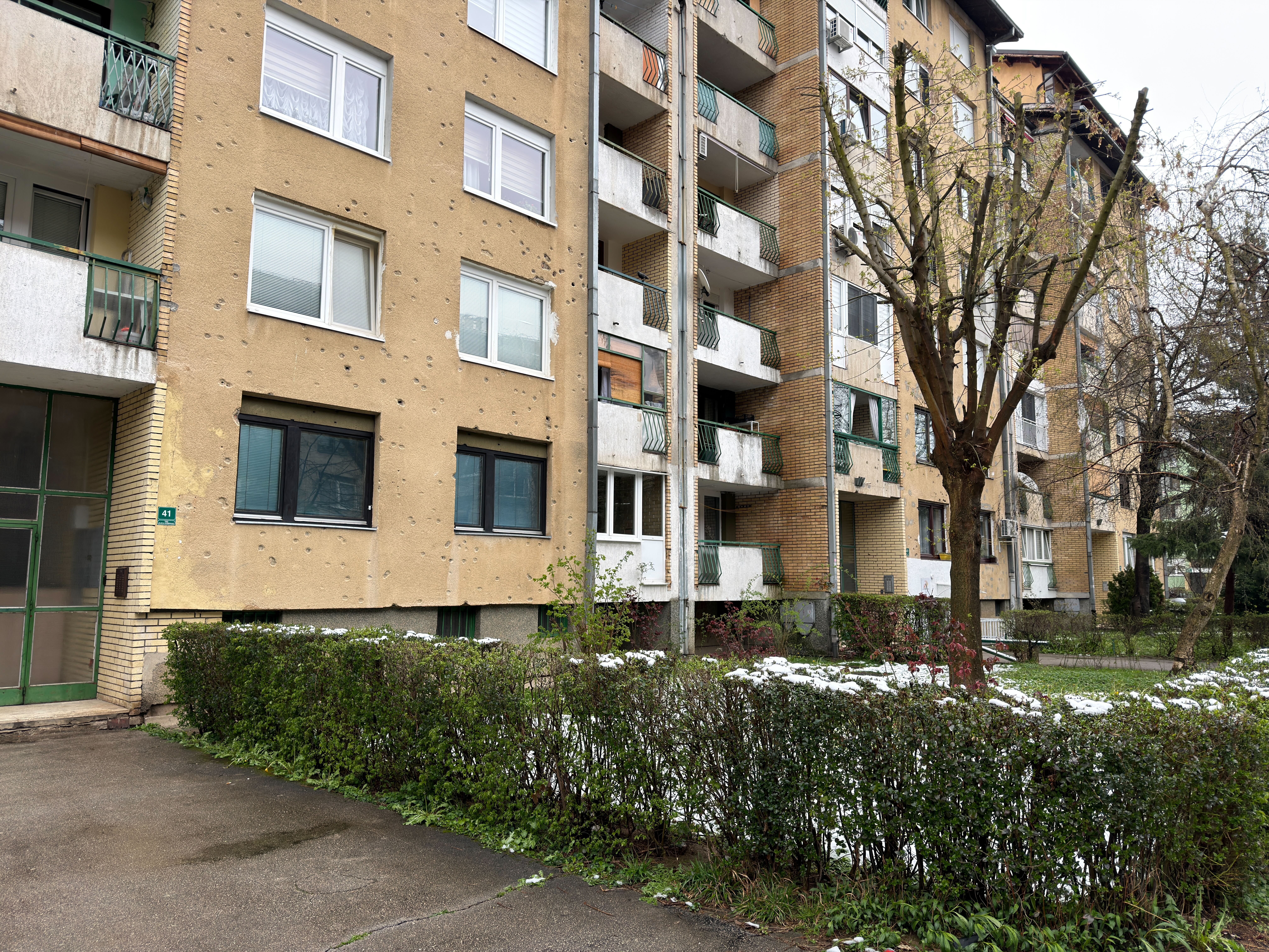 Zmarznięci i nieco zmęczeni spacerem w taką pogodę docieramy w okolice bloku, w którym aktualnie mieszka Damir z rodzicami. To spokojna, zielona ulica z niskimi zabudowaniami. Na beżowej elewacji ślady po kulach i odłamkach pocisków. Znowu.
