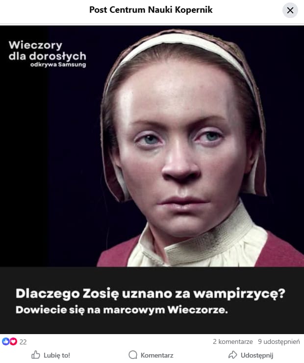 Naukowcy zrekonstruowali twarz „wampirzycy Zosi”. Fot. Facebook/Centrum Nauki Kopernik (fot. Facebook / Centrum Nauki Kopernik)
