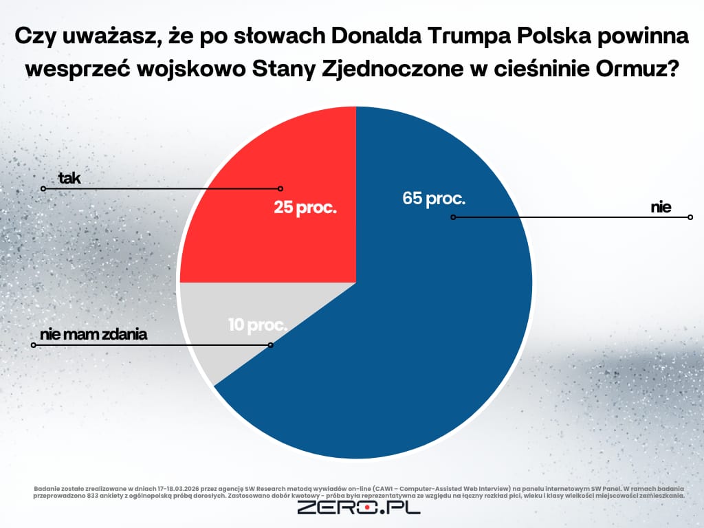 „Czy uważasz, że po słowach Donalda Trumpa Polska powinna wesprzeć wojskowo Stany Zjednoczone w Cieśninie Ormuz?” – takie pytanie usłyszeli ankietowani sondażu SW Research dla Zero.pl.