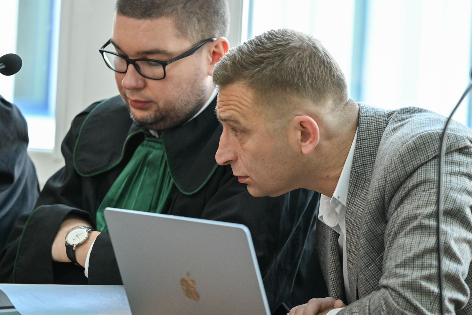 Warszawa, 01.04.2026. Działacz środowisk narodowych Robert Bąkiewicz (P) na sali rozpraw Sądu Rejonowego dla Warszawy Śródmieścia, 1 bm. Trwa proces byłego przewodniczącego Stowarzyszenia Marsz Niepodległości Roberta Bąkiewicza ws. naruszenia nietykalności cielesnej aktywistki Angeliki Domańskiej podczas protestów przeciwko wyrokowi Trybunału Konstytucyjnego w sprawie aborcji w 2020 r. (jm) PAP/Piotr Nowak (fot. Piotr Nowak / PAP)