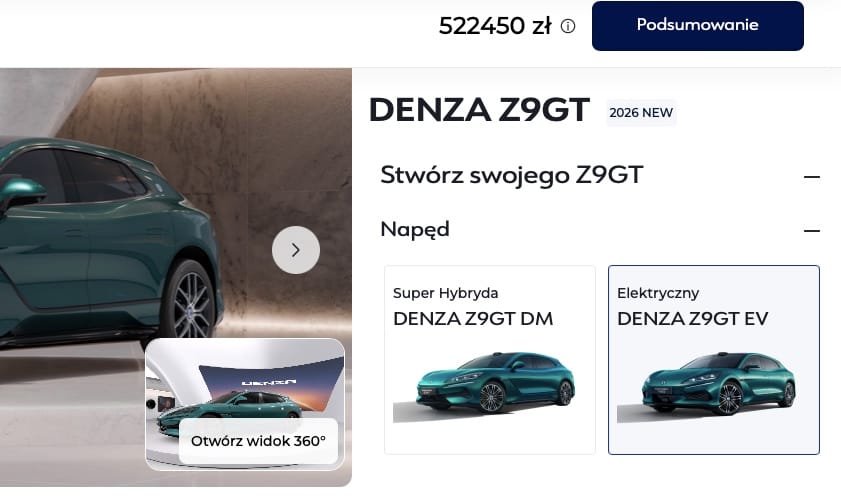 Może zapatrzyli się na Porsche Taycan, które bazowo kosztuje od 474 tys. zł za wersję z napędem na jedną oś i uznali, że muszą być lepsi? Na oficjalnej stronie Denzy nie znajdziemy danych technicznych modelu Z9 GT, ani elektrycznego, ani hybrydy – wyszukałem, że wariant elektryczny ma osiągać 100 km/h w 2,7 sekundy, co stawiałoby go na równi z Taycanem Turbo, kosztującym 815 tys. zł. Może to jednak okazja?