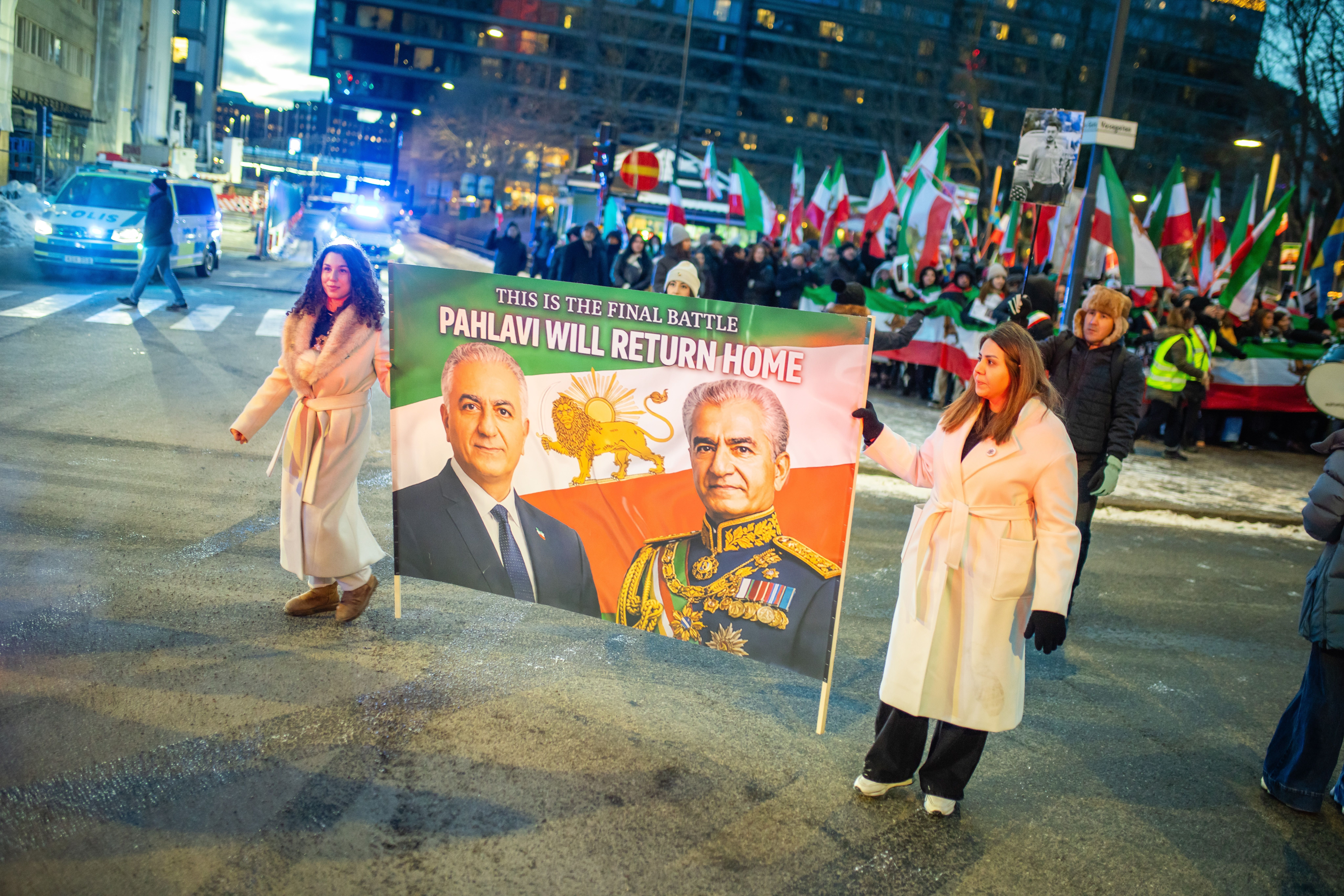 Protesty irańskiej diaspory w Sztokholmie (Szwecja). Na plakacie szach Iranu Mohammad Reza Pahlawi oraz jego syn, który dziś nawołuje do obalenia rządów ajatollahów. (fot. Angela Kotsell / Shutterstock)