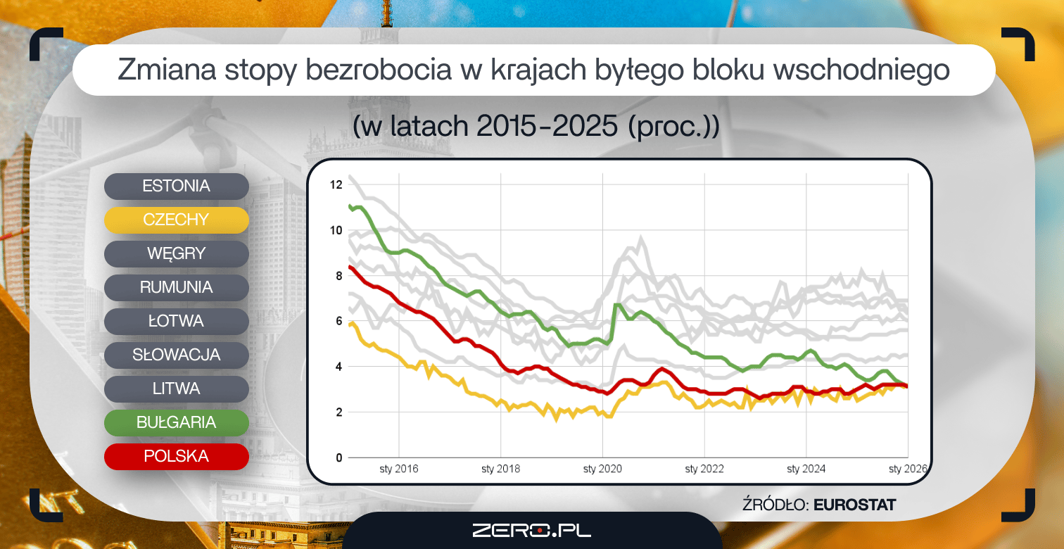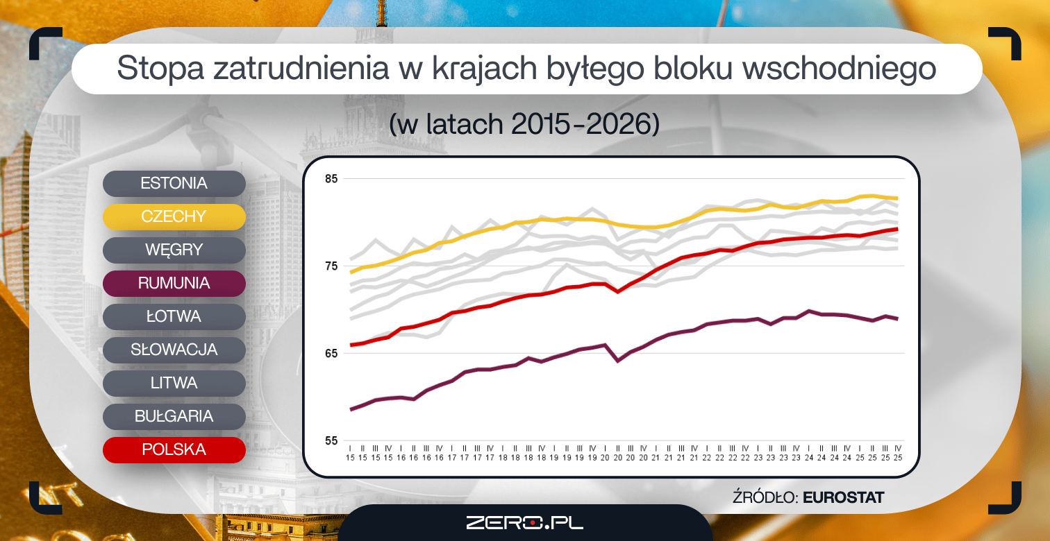 Ten także systematycznie się polepsza. W IV kwartale 2019 r. (ostatni przedpandemiczny odczyt) stopa zatrudnienia w Polsce wynosiła 72,9 proc. Pod koniec 2025 r. to już 79,2 proc., czyli o 6,3 pkt. proc. więcej. Czy to duży wzrost? W ciągu zaledwie sześciu lat udało nam się wyprzedzić pod tym względem Bułgarię, Słowację oraz Łotwę, a przy utrzymaniu obecnych trendów w ciągu najbliższych 2-3 lat moglibyśmy dogonić także Litwę oraz Węgry. Choć do regionalnego lidera, czyli Czech, jeszcze trochę nam brakuje (82,7 proc.), to nasz wynik można już uznać za dobry. Jeszcze w 2015 r. zajmowaliśmy 21. miejsce w UE, obecnie jesteśmy na 13. miejscu (a wspomniani Czesi zajmują trzecią lokatę).