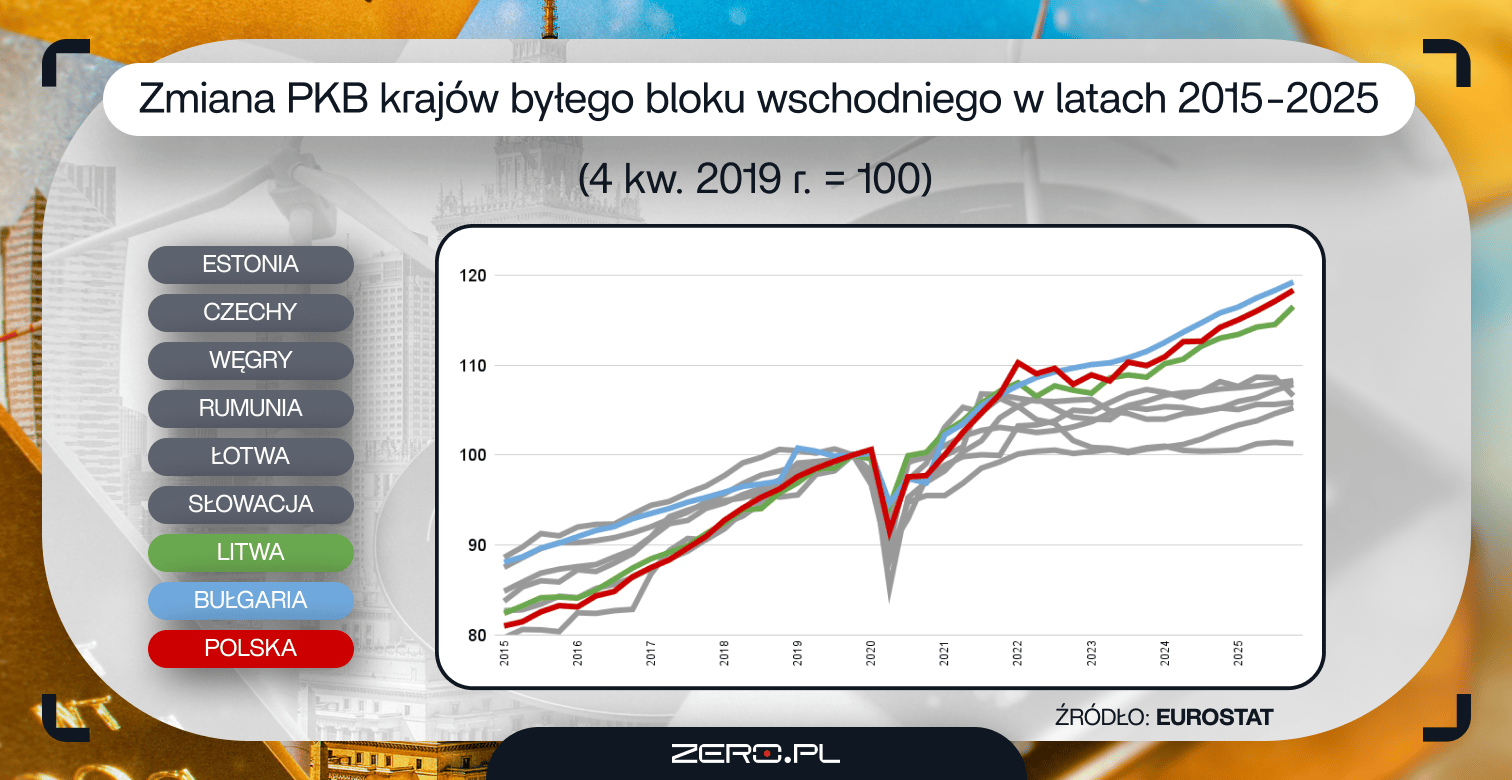 Wśród państw z naszego regionu jedynie silnie związana z polską gospodarką Litwa (16,5 proc. wzrostu) zbliżyła się do naszego wyniku. Długo kroku dotrzymywały nam także Estonia, Rumunia oraz Węgry, ale dziś te kraje mierzą się ze stagnacją. W Estonii poważnych wzrostów nie widzieliśmy już od końca 2021 r., na Węgrzech stagnacja trwa od wybuchu wojny w Ukrainie, a Rumunia przestała dotrzymywać nam kroku na początku 2024 r. Najnowsze prognozy Komisji Europejskiej z jesieni 2025 r. potwierdzają, że także w latach 2026-2027 Polska będzie wieść pod tym względem prym. PKB wzrośnie o kolejno 3,5 oraz 2,8 proc., co nie licząc małej Malty, będzie najwyższym wzrostem w całej UE.