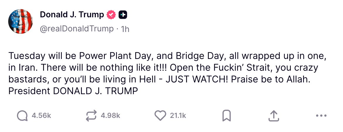 „Wtorek w Iranie będzie Dniem Elektrowni oraz Dniem Mostów w jednym” – stwierdził Trump w emocjonalnym wpisie. „Otwórzcie piep… cieśninę, wariaci, albo będziecie żyć w piekle” – dodał prezydent USA, a na koniec jeszcze napisał: „Chwała Allahowi”.