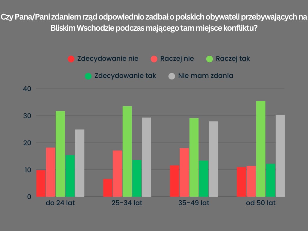 Dla każdej grupy wiekowej (do 24 lat, 25-34 lat, 35-49 lat, od 50 lat) opinia o reakcji rządu jest podobna – nie widać drastycznych różnic w ocenie tego, czy rząd zadbał o Polaków na Bliskim Wschodzie.