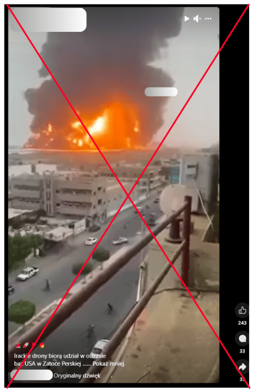 "Irackie drony biorą udział w ostrzale baz USA w Zatoce Perskiej" – to już opis rolki opublikowanej prawdopodobnie 28 lutego na Facebooku i wyświetlonej ok. 27 tys. razy. To samo wideo opublikował 28 lutego również jeden z użytkowników X – zebrał blisko 30 tys. wyświetleń.