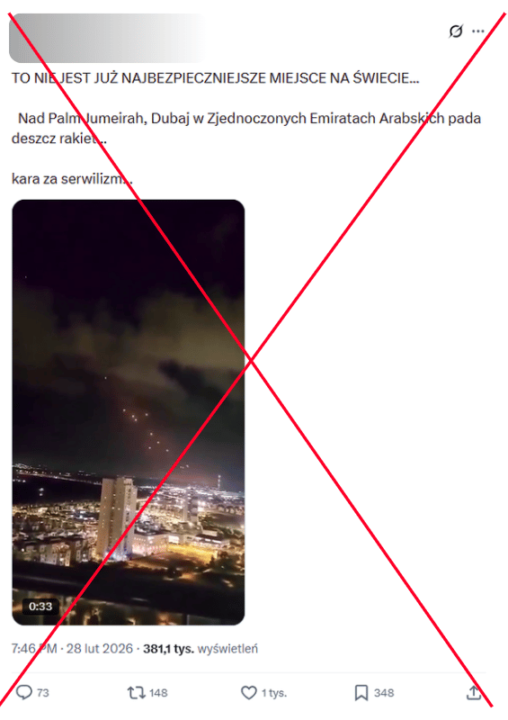 "To nie jest już najbezpieczniejsze miejsce na świecie... Nad Palm Jumeirah, Dubaj w Zjednoczonych Emiratach Arabskich pada deszcz rakiet... kara za serwilizm..." – napisał 28 lutego jeden z użytkowników X. Na opublikowanym przez niego nagraniu widać nocną panoramę miasta i lecące nad nim świetliste obiekty. Film wyświetlono blisko 400 tys. razy.