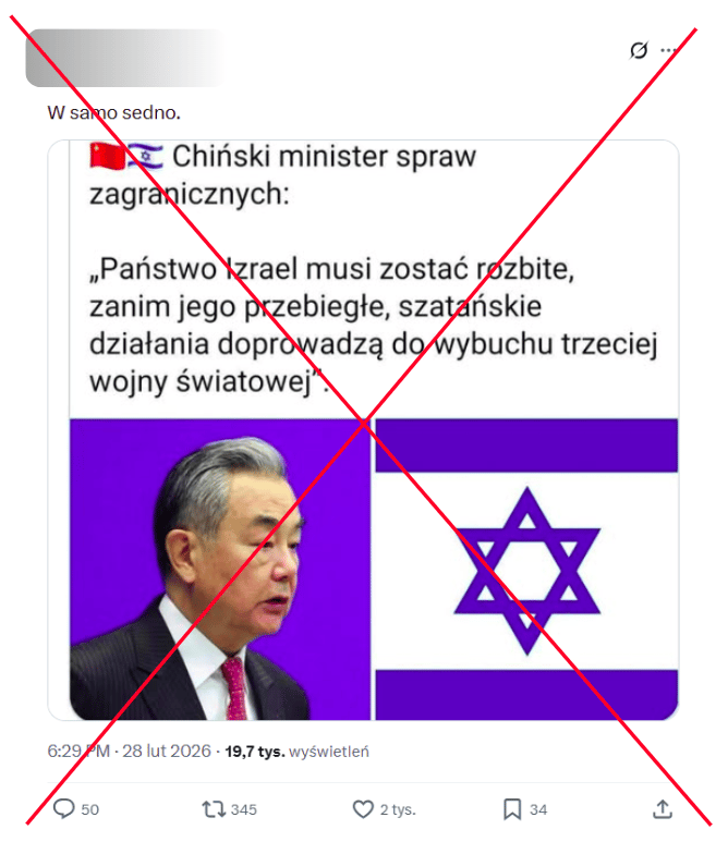 28 lutego w sieci krążył również cytat przypisywany ministrowi spraw zagranicznych Chin Wangowi Yi: "Państwo Izrael musi zostać rozbite, zanim jego przebiegłe, szatańskie działania doprowadzą do wybuchu trzeciej wojny światowej". Tylko na X post został wyświetlony blisko 20 tys. razy.