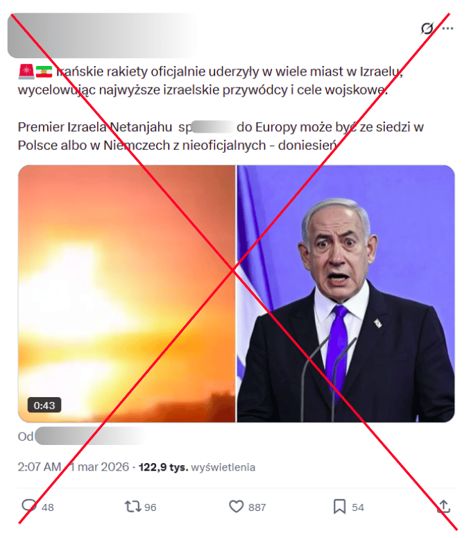 Na innym koncie regularnie rozprowadzającym przekazy zbieżne z rosyjskimi 1 marca pojawiła się fałszywa informacja o ucieczce premiera Izraela do Europy. "Irańskie rakiety oficjalnie uderzyły w wiele miast w Izraelu, wycelowując najwyższe izraelskie przywódcy i cele wojskowe. Premier Izraela Netanjahu s... do Europy może być ze siedzi w Polsce albo w Niemczech z nieoficjalnych – doniesień" (pisownia oryginalna).