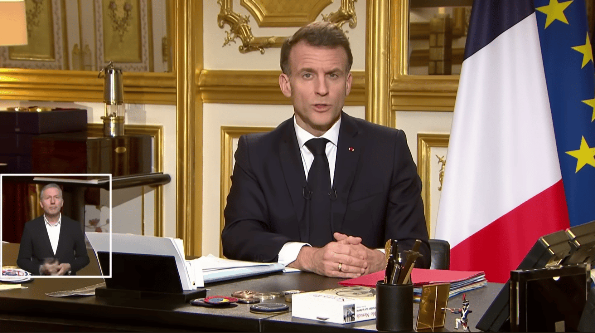Prezydent Francji, swoim zwyczajem, starannie wyreżyserował telewizyjne wystąpienie, naszpikowując swój gabinet labiryntem podprogowych znaczeń i symboli. (fot. YT/Elysee)
