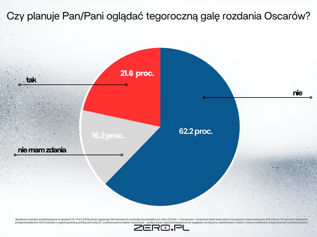 Pracownia SW Research na zlecenie Zero.pl sprawdziła, jakim zainteresowaniem cieszy się gala rozdania Oscarów wśród Polaków. Uczestników badania zapytano o to, czy planują oglądać tegoroczną galę.