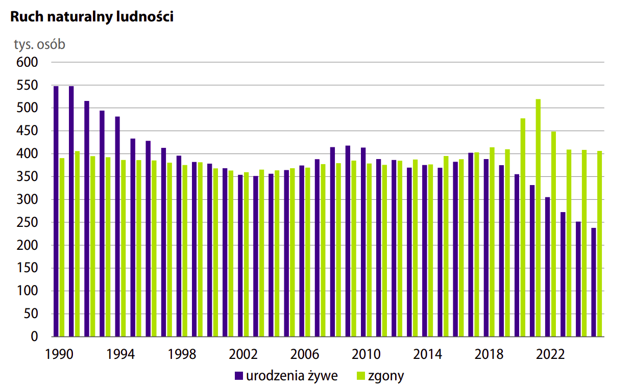 Malejąca liczba urodzeń i stale przewyższająca ją liczba zgonów przełożyły się na spadek populacji w Polsce. Źródło: GUS. (fot. Sytuacja społeczno-gospodarcza kraju 12/2025 w 2025 r. / GUS)