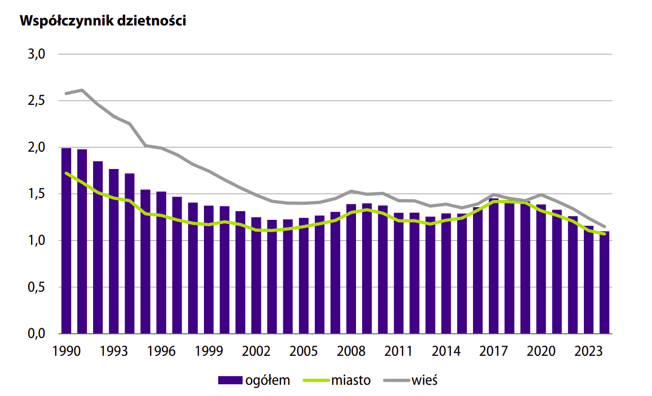 Współczynnik dzietności to średnia liczba dzieci, które urodziłaby kobieta w ciągu całego okresu rozrodczego. Źródło: GUS. (fot. Sytuacja społeczno-gospodarcza kraju 12/2025 w 2025 r. / GUS)