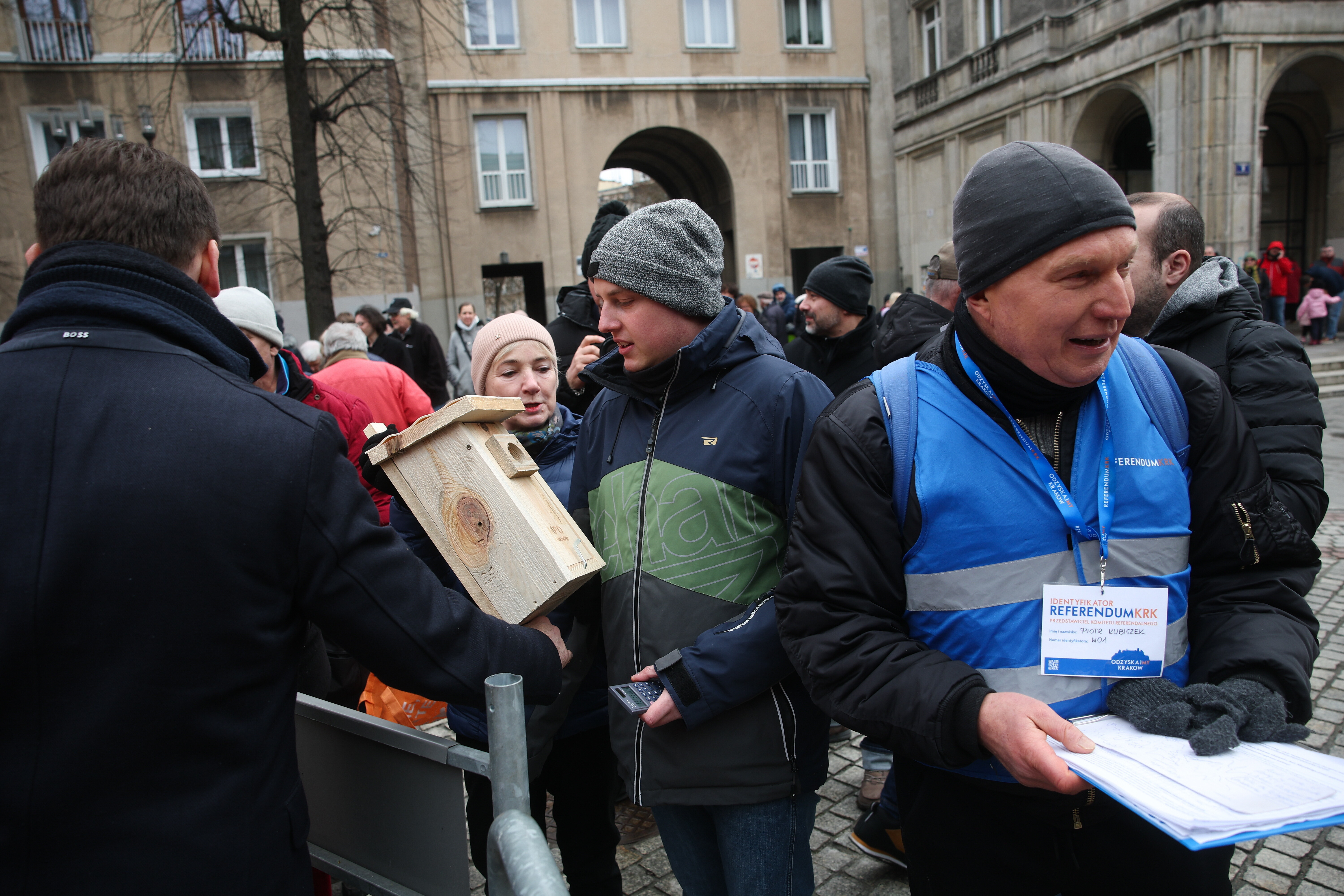 Kraków, 14.02.2026. Zbiórka podpisów pod wnioskiem o refendum ws. odwołania prezydenta Krakowa Aleksandra Miszalskiego. PAP/Łukasz Gągulski