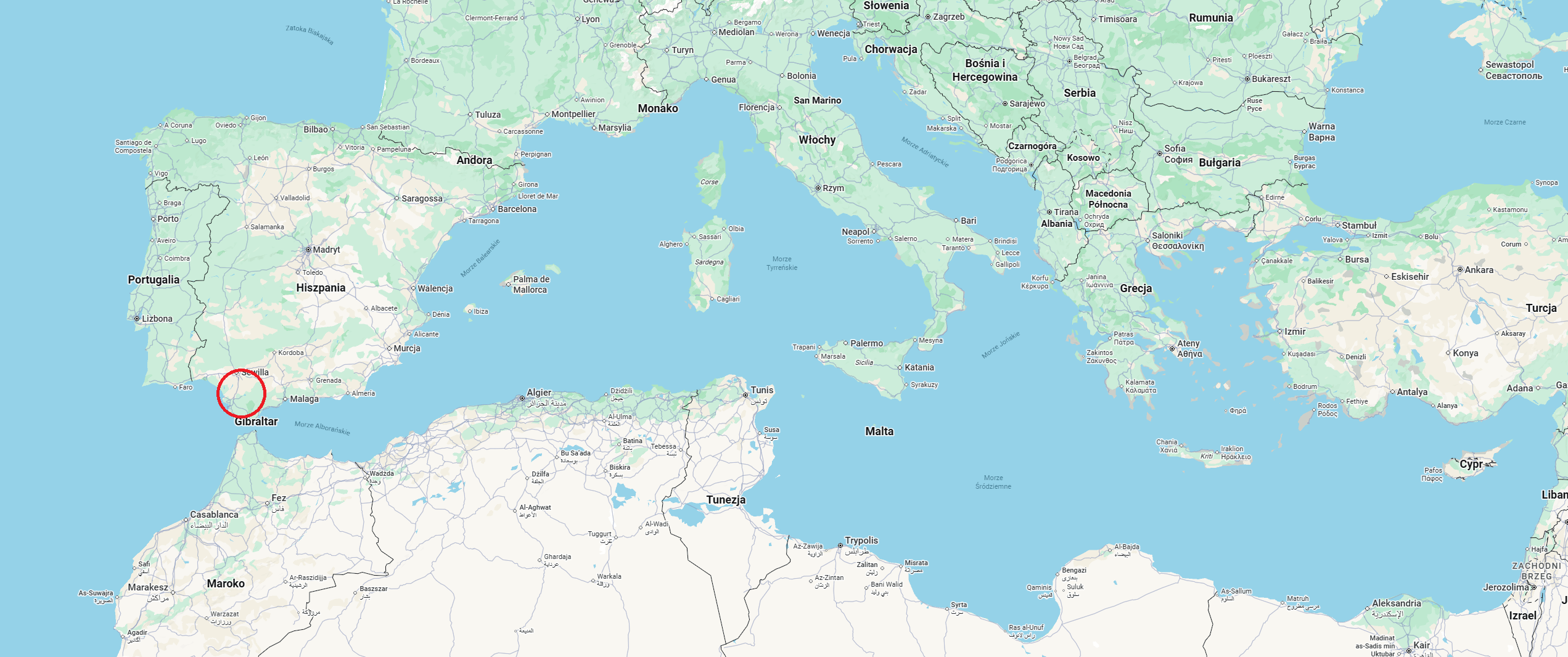 Region, w którym znajdują się bazy Morón i Rota. (fot. Google Maps, Zero.pl)