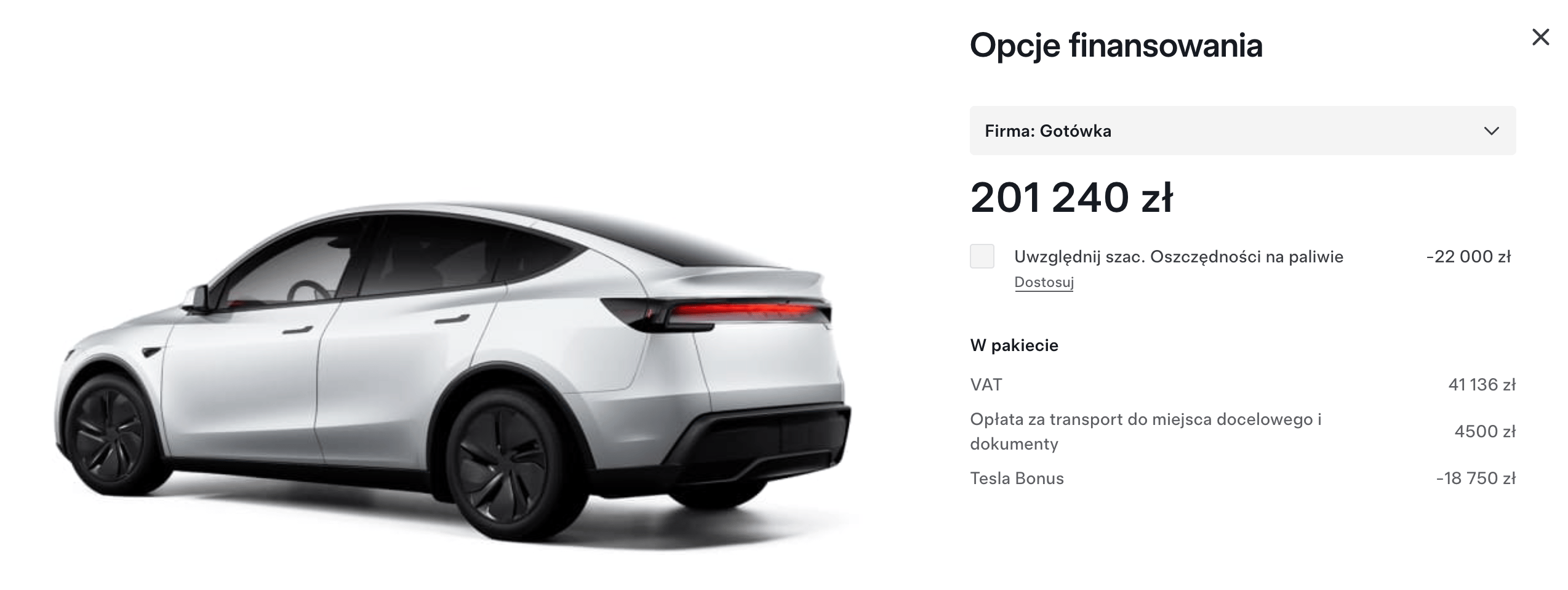 Co ważne, własne finansowanie nie oznacza tylko przybycia do salonu z walizką złotówek. Można równie dobrze sfinansować zakup leasingiem czy kredytem zewnętrznym. Chodzi o to, aby nie korzystać z instrumentów finansowych od Tesli. Dasz im gotówkę – masz bonus.