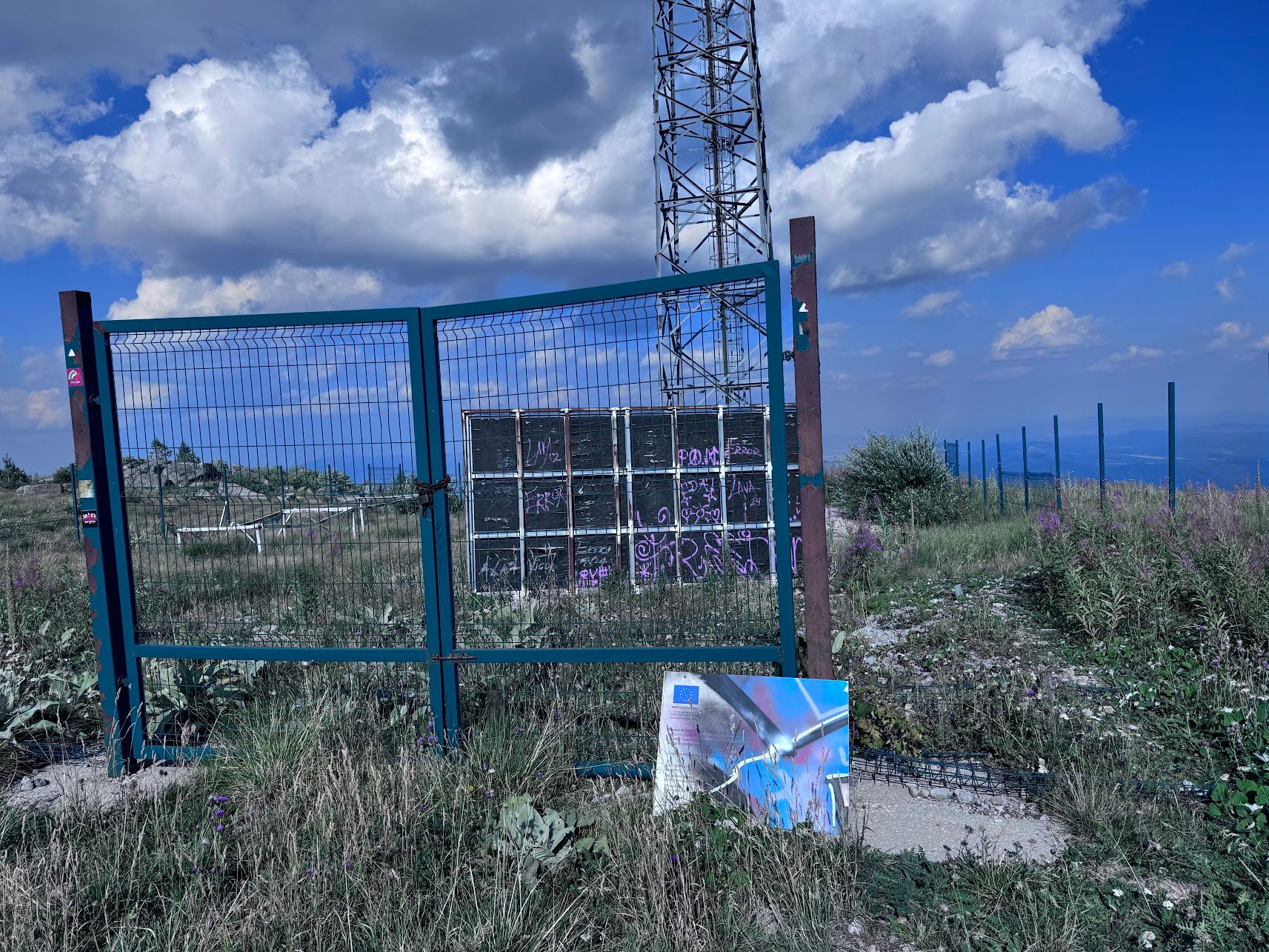 Stalowa wieża, zniszczone ogrodzenie i tablica z informacją o dofinansowaniu ze środków Unii Europejskiej. Góra Vitosha. 20 sierpnia 2025 r. (fot. Tomasz Pałasz / Zero.pl)