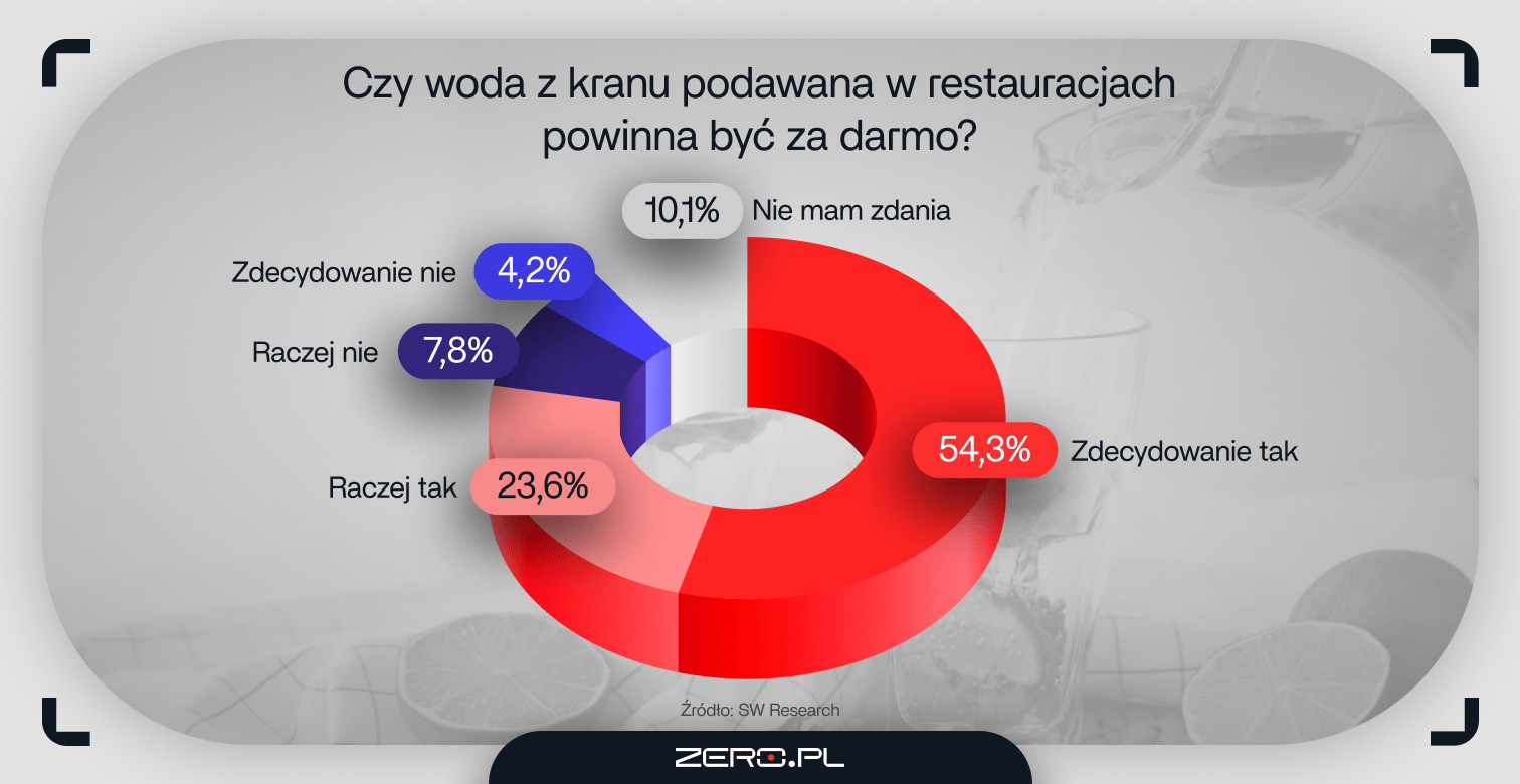 Polacy oczekują takiego rozwiązania. Jak wynika z sondażu SW Research dla Zero.pl, 77,8 proc. badanych odpowiedziało twierdząco na pytanie „Czy woda z kranu podawana w restauracjach powinna być za darmo?”. Pomysł zdecydowanie poparło 54,3 proc. badanych, a 23,6 proc. odpowiedziało: „raczej tak”. Przeciwko było 12,1 proc. respondentów (w tym 4,2 proc. odpowiedziało „zdecydowanie nie”), a 10,1 proc. nie miało zdania.