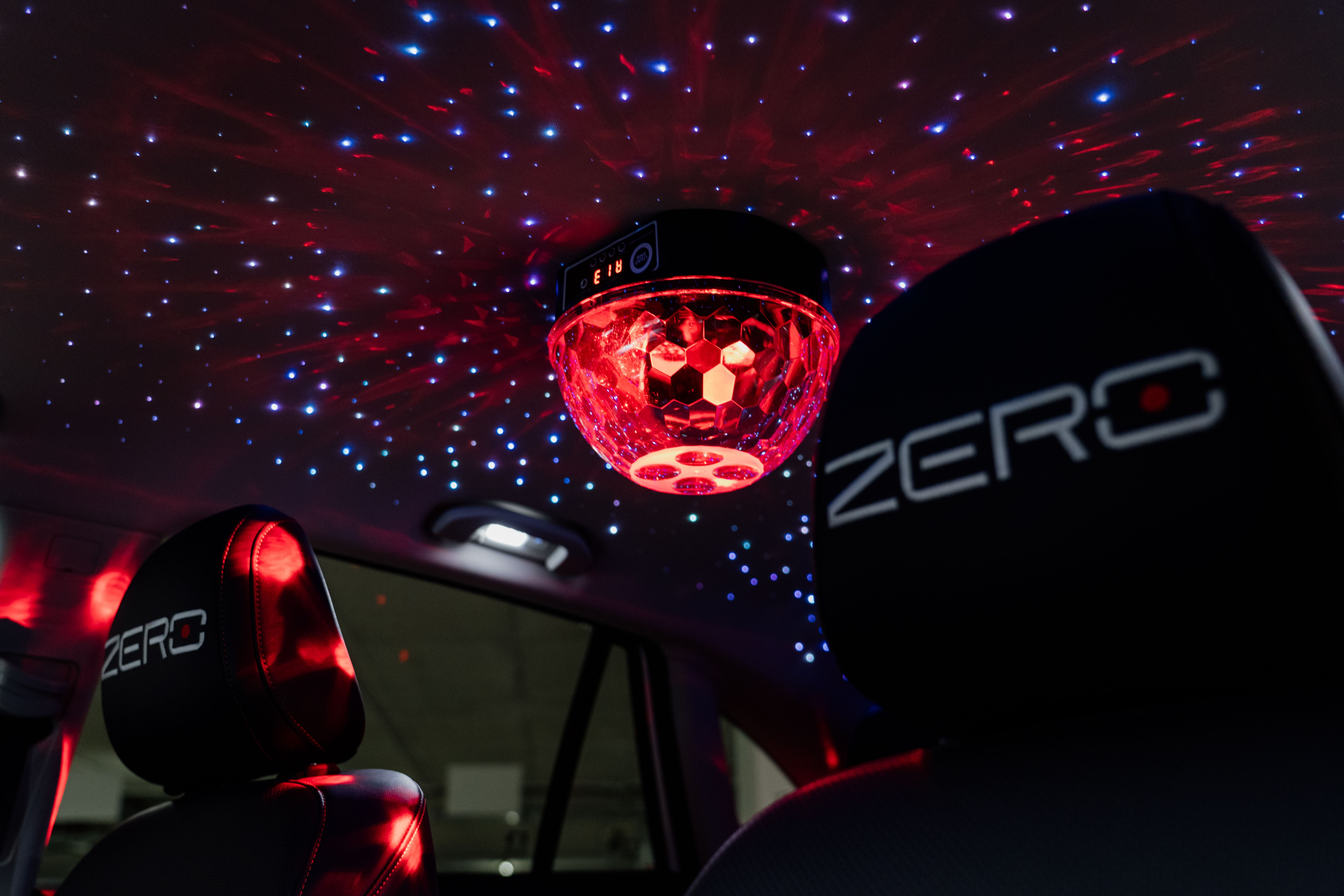 Świetne wrażenie robią też zagłówki z ręcznie wyszytym logotypem Zero, ale tak naprawdę robotę robi tu LED-owe podświetlenie całego nadwozia. Wiemy oczywiście, że w Polsce jest to nielegalne w ruchu drogowym. To opcja, którą chwalimy się tylko w firmowym garażu, a w przyszłości zapewne na eventach Kanału Zero.