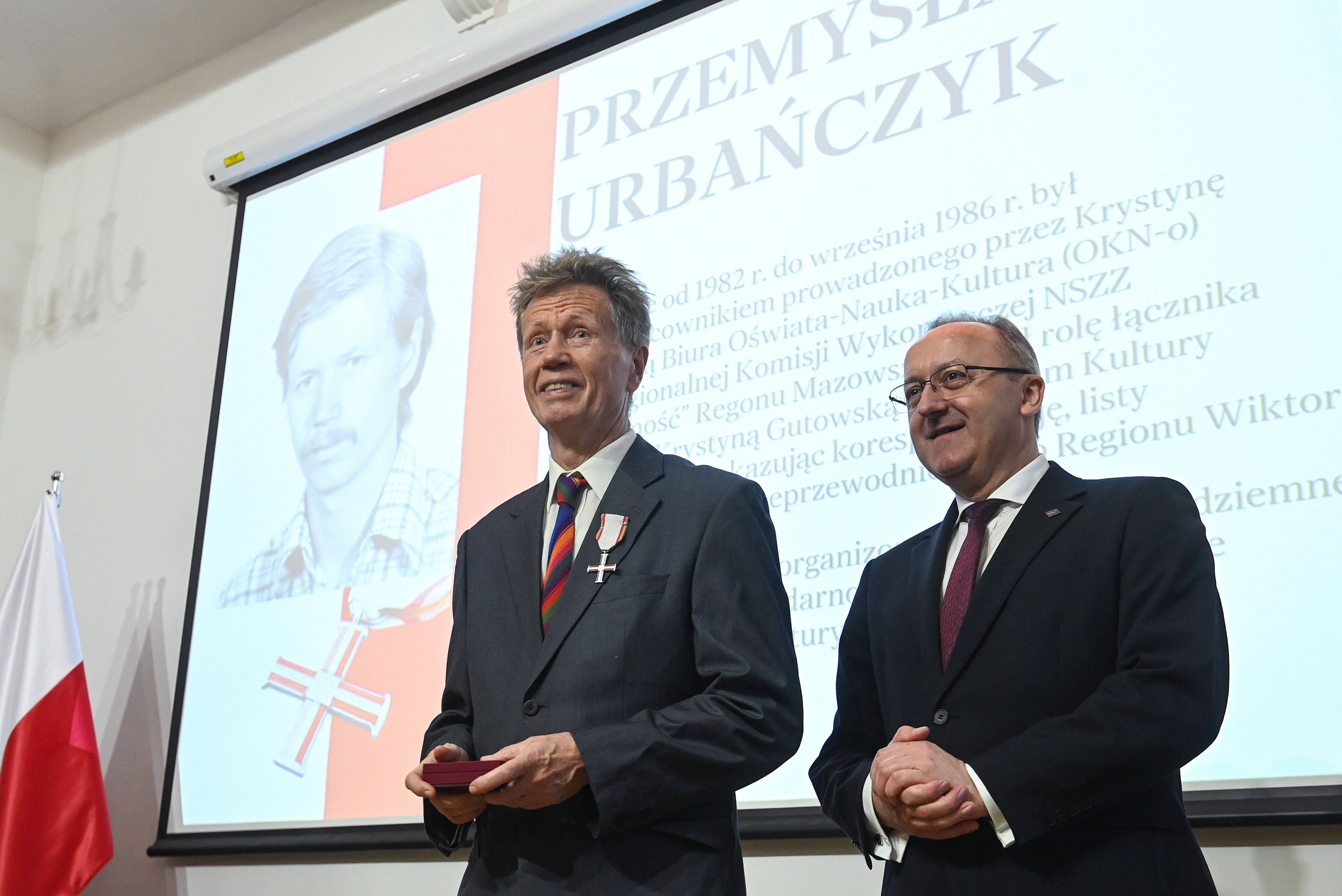 Warszawa, 13.12.2025. Prof. Przemysław Urbańczyk (z lewej) podczas obchodów 44. rocznicy wprowadzenia stanu wojennego. (fot. Piotr Nowak / PAP)