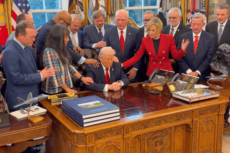 Na krótkim filmiku z Gabinetu Owalnego widać grupę ponad 20 osób, które stoją nad siedzącym przy biurku prezydentem Donaldem Trumpem i wznoszą za niego modlitwy.