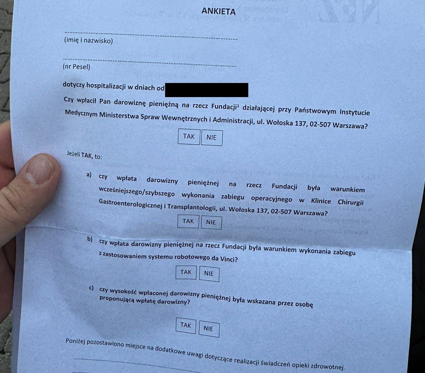 NFZ do części pacjentów wysłał ankietę z prośbą o odpowiedzi, by informacje wynikające z dokumentacji szpitalnej potwierdzić bezpośrednio u ludzi.