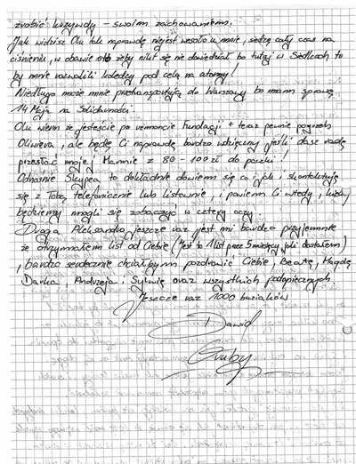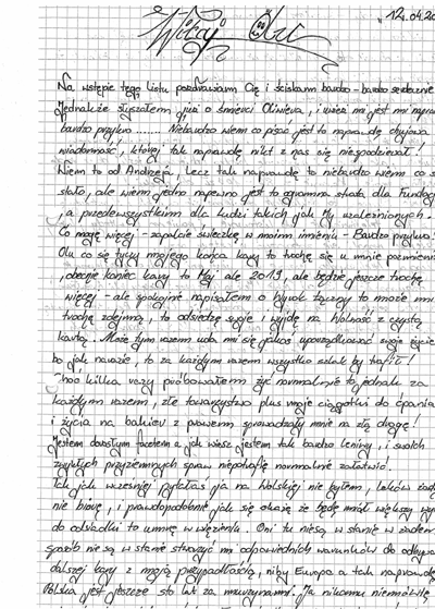 „Tak jak wcześniej pytałaś, ja na Wolskiej nie byłem, leków żadnych nie biorę i prawdopodobnie okaże się, że będę miał większy wyrok do odsiadki, to umrę w więzieniu. Oni tu nie są w stanie w żaden sposób stworzyć mi odpowiednich warunków do odbywania dalszej kary z moją przypadłością. Niby Europa a tak naprawdę Polska jest jeszcze sto lat za murzynami” (pisownia oryginalna – red.) – pisał Dawid Mazur w liście do pani Aleksandry z fundacji Prekursor.