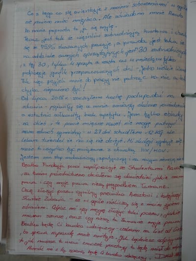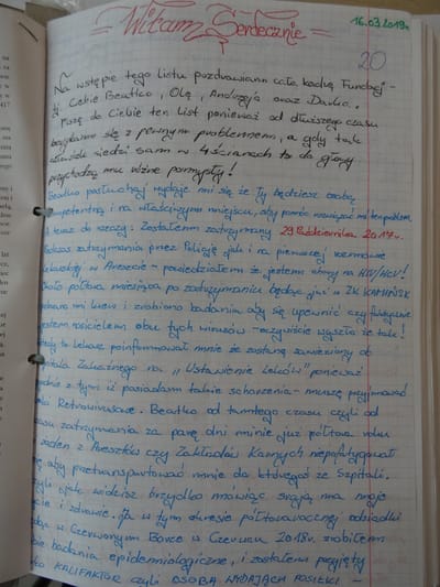 „Od dłuższego czasu borykam się z problemem, a gdy tak człowiek siedzi sam w czterech ścianach, to do głowy przychodzą mu różne pomysły. Ale do rzeczy. Zostałem zatrzymany przez policję 29 października 2017 r. Podczas zatrzymania, jak i na pierwszej rozmowie lekarskiej w areszcie powiedziałem, że mam HIV i HCV. Około półtora miesiąca po zatrzymaniu w Kamińsku pobrano mi krew i zrobiono badania. Wyszły pozytywnie. Wtedy lekarz poinformował mnie, że zostanę zawieziony do szpitala zakaźnego na »ustawienie leków«. Od tamtego czasu za parę dni minie półtora roku i żaden z zakładów nie pofatygował się, by przetransportować mnie do któregoś ze szpitali” – pisał do Beaty Stelmaszczyk.