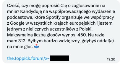 Użytkownicy serwisu X otrzymują wiadomości z prośbą o oddanie głosu w konkursie na współprowadzącego podcast. Wiadomość na pierwszy rzut oka może nie budzić podejrzeń, jednak to nic innego jak kolejna próba przejęcia kont przez oszustów. Zgłoszenia w tej sprawie dotarły już do NASK.