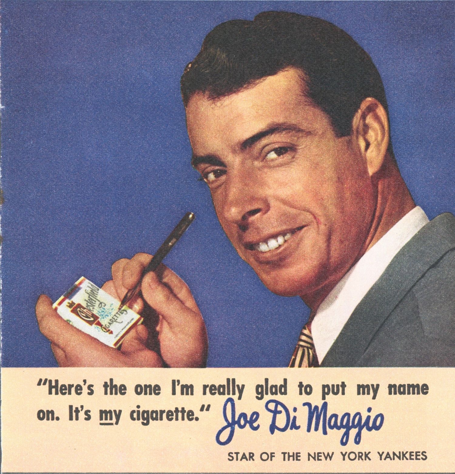 Reklama papierosów Camel z 1941 roku. Widoczny na zdjęciu pan, to Joe Di Maggio - jeden z najpopularniejszych sportowców w USA tamtego okresu. Używanie gwiazd sportu do promocji nałogu, było w tamtym czasie standardową praktyką.