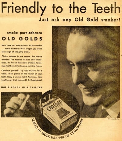 Reklama papierosów Old Golds z 1930 r. Producenci przekonywali w tamtym okresie, że są one przyjazne dla zębów. Źródło: Stanford Research into the Advertising of Tobacco / P. Lorillard