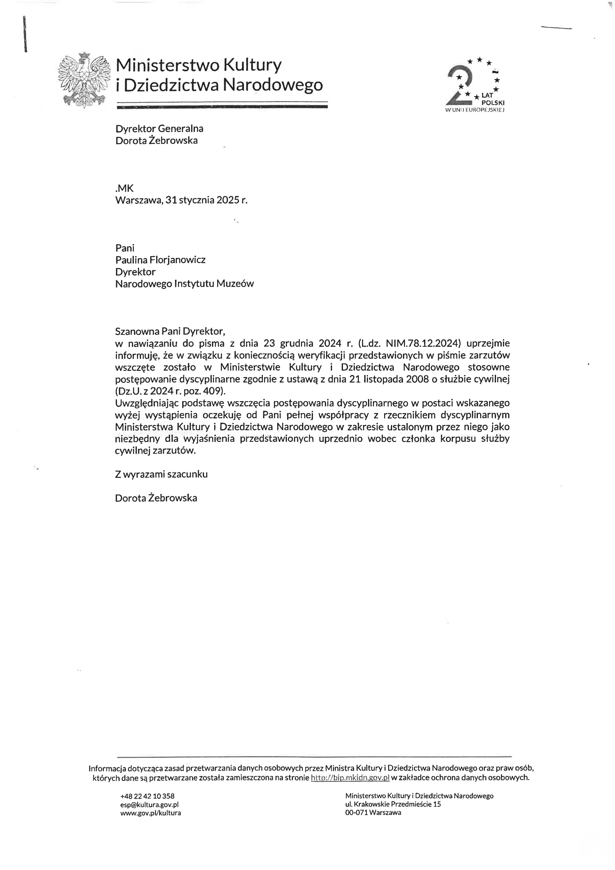 31 stycznia 2025 r. dostała oficjalną odpowiedź od resortu podpisaną przez Dorotę Żebrowską – dyrektor generalną w MKiDN. Wszczęto postępowanie dyscyplinarne.