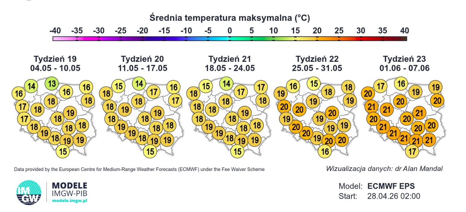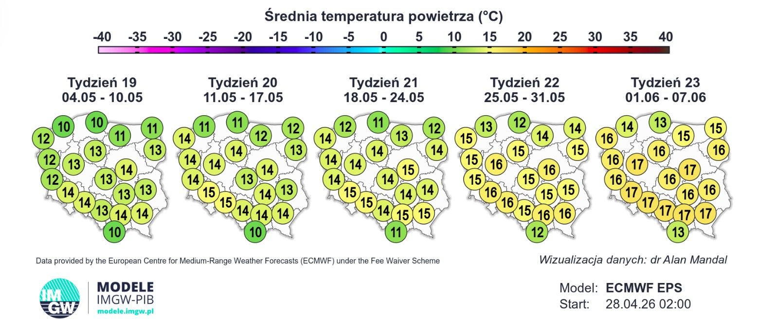 Wyższa średnia maksymalnych temperatur, sięgająca na południu, zachodzie i w centrum kraju powyżej 20 st. C, utrzyma się dopiero w drugim tygodniu maja i na początku czerwca. Europejskie Centrum Prognoz Średnioterminowych podało, że ten okres będzie już wyraźnie cieplejszy. Średnia temperatur wyniesie maksymalnie 15-16 st. C w maju i 16-17 st. C w czerwcu, a przymrozki ustąpią już na stałe.