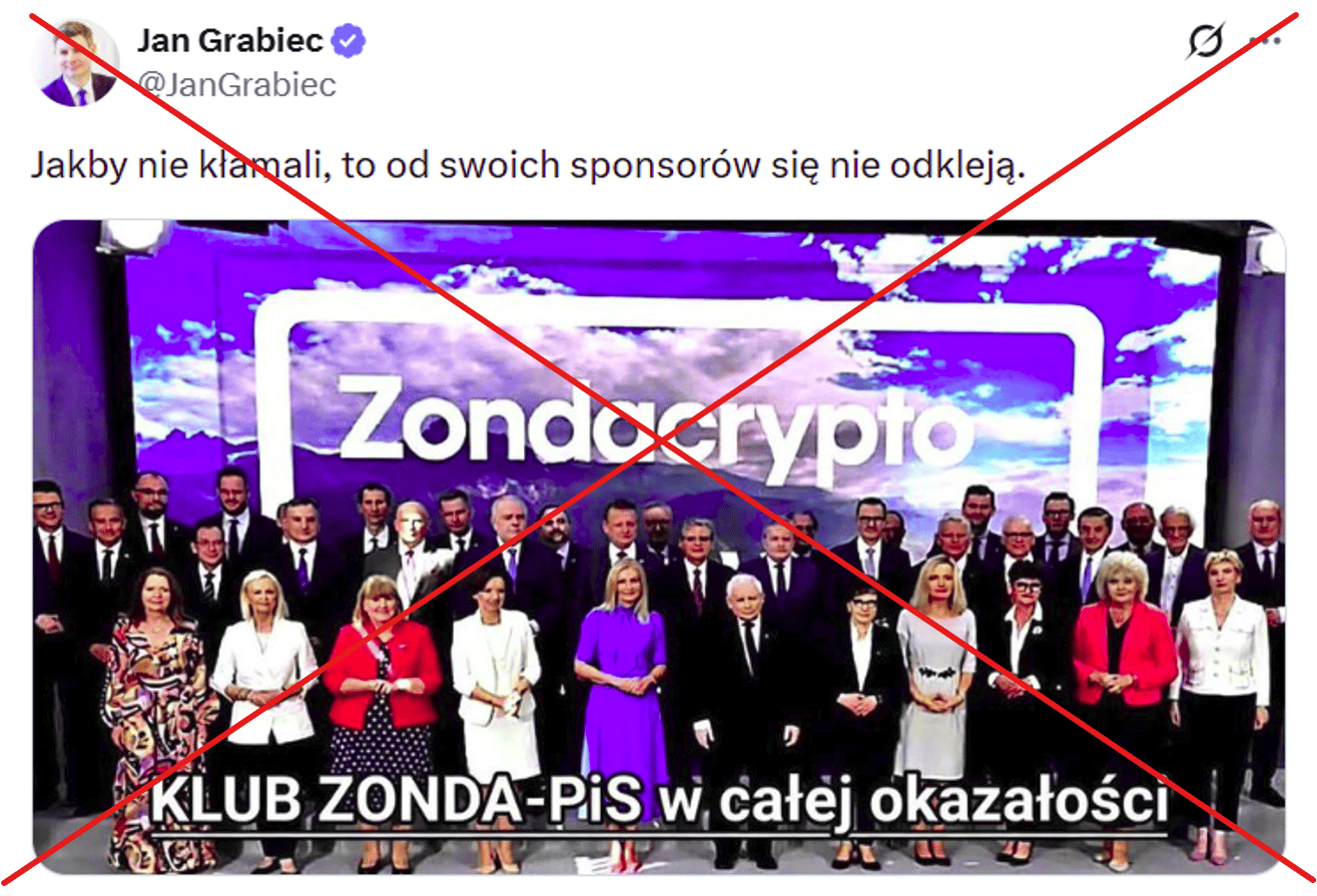 „Jakby nie kłamali, to od swoich sponsorów się nie odkleją” – napisał w sobotę na X Jan Grabiec, szef Kancelarii Prezesa Rady Ministrów. Opublikował również zbiorowe zdjęcie najważniejszych polityków Prawa i Sprawiedliwości na tle napisu Zondacrypto. Tego samego dnia takie samo zdjęcie pojawiło się na profilu posła Koalicji Obywatelskiej Romana Giertycha.