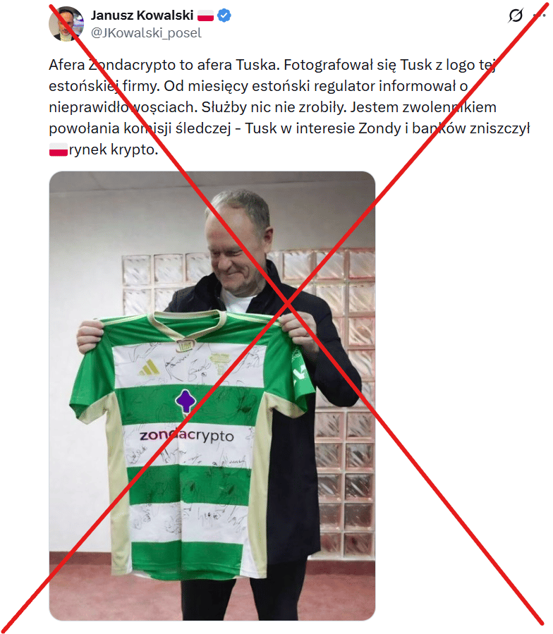Kilka dni wcześniej inną przeróbkę opublikował poseł Janusz Kowalski – przedstawiała Donalda Tuska pozującego z koszulką Lechii Gdańsk z logo Zondacrypto. Tusk rzeczywiście dostał taką koszulkę w prezencie podczas jednego ze spotkań z młodymi sportowcami. Kowalski przerobił jednak fotografię w taki sposób, by napis Zondacrypto był na niej widoczny.