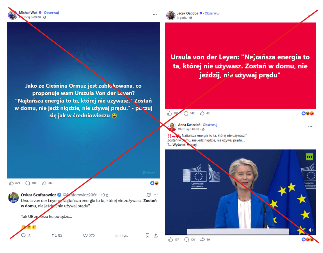 Podobny cytat dzień wcześniej opublikował poseł PiS Michał Woś. Posłanka Anna Kwiecień również przypisywała von der Leyen takie słowa, a dodatkowo opublikowała wideo z wypowiedzią szefowej KE. Von der Leyen mówiła na nim o ograniczaniu popytu na energię, ale nie wspomniała o rezygnacji z prądu czy o pozostawaniu w domu.