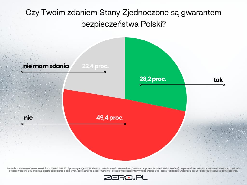 Na pytanie „Czy twoim zdaniem Stany Zjednoczone są gwarantem bezpieczeństwa Polski?” odpowiedzi pozytywnej w sondażu SW Research udzieliło 28,2 proc. respondentów. Przeciwnego zdania była prawie połowa ankietowanych – 49,4 proc. Pozostali uczestnicy badania nie mieli zdania w tej kwestii – taką odpowiedź wybrało 22,4 proc. respondentów.