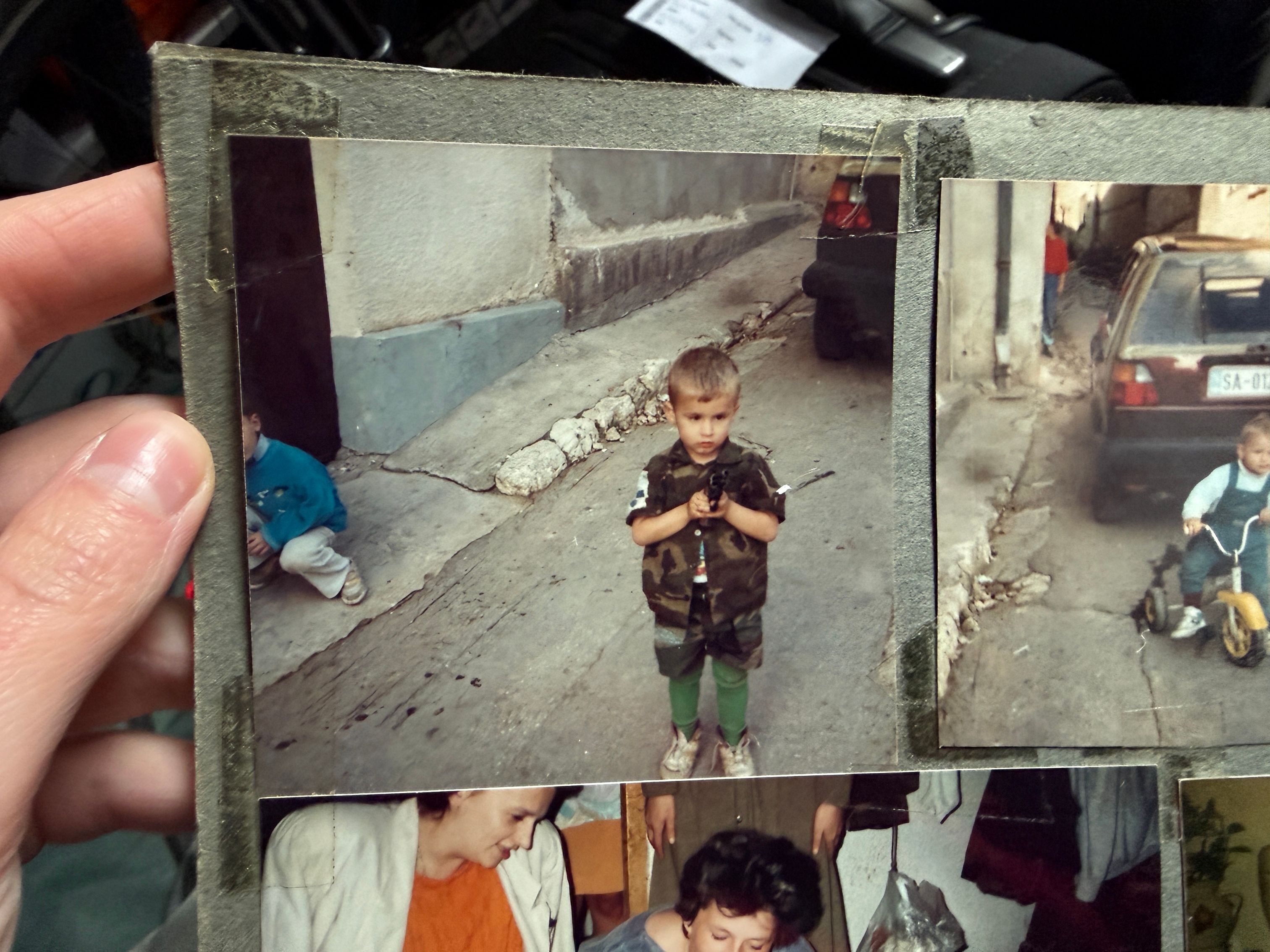 Długo szuka. Przegląda kolejne fotografie – z urodzin, imprez rodzinnych. Widzę też żołnierza, który przyszedł do nich w gości, auta podziurawione kulami przed domem, babcię i dziadka na tle ściany ze śladami po ostrzale. I jest. Małe, lekko wyblakłe zdjęcie. Chłopiec z bratem oraz mamą i tatą przy straganie.