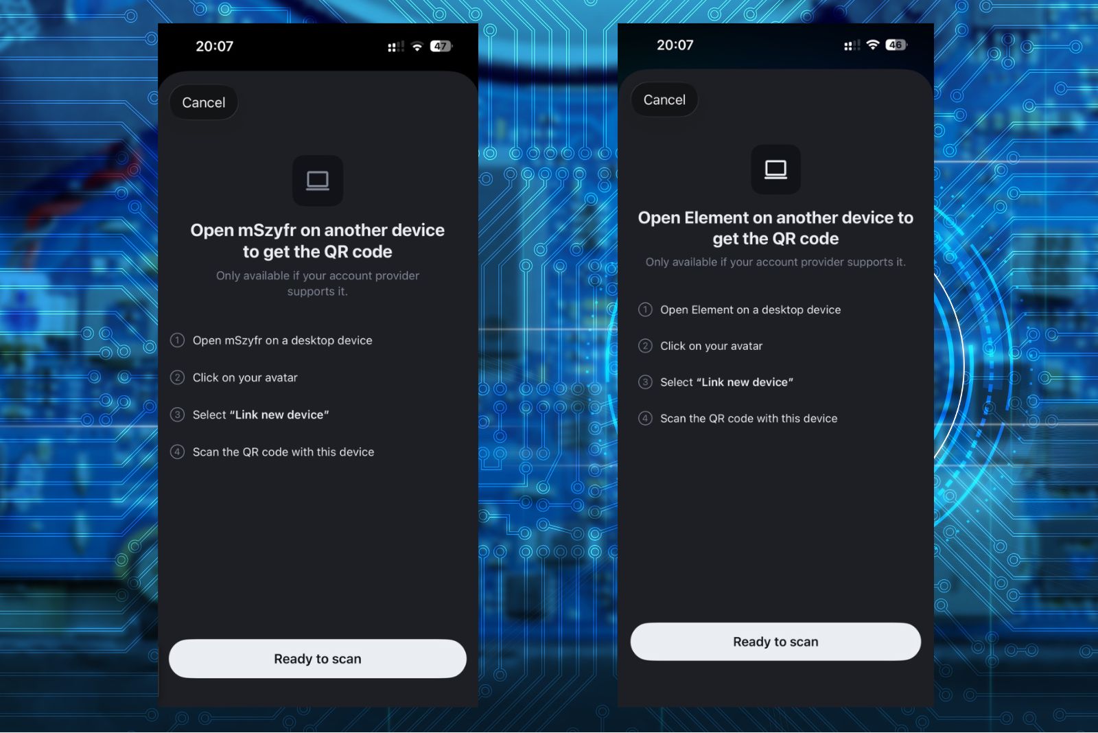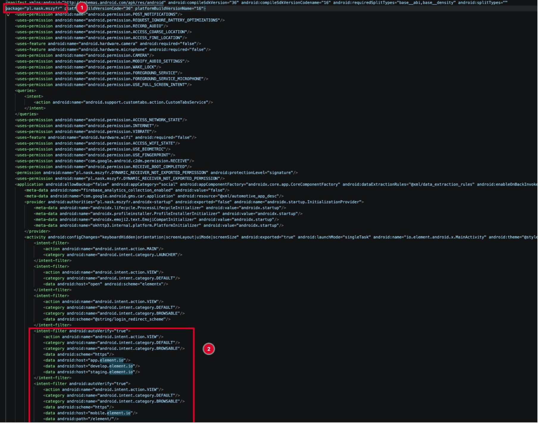 Już pobieżna analiza pakietu wykazała, że androidowy klient mSzyfr – choć nie jest kopią programu Element X – ma z nim wiele wspólnych cech. Współdzieli nie tylko wygląd i część plików. W kodzie mSzyfru można znaleźć bezpośrednie odwołania do domeny element.io. Nazwa element.io pojawia się też na jednym ze zrzutów ekranu zamieszczonym w instrukcji instalacji.