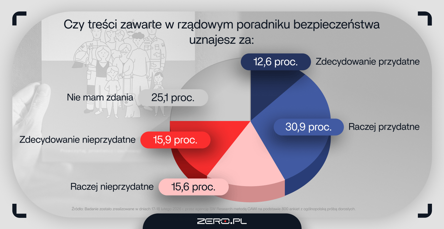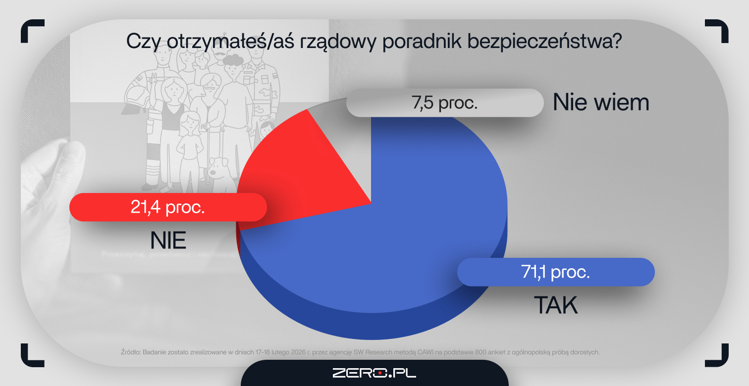 Z badania SW Research przeprowadzonego na zlecenie Zero.pl wynika, że 71,1 proc. respondentów deklaruje otrzymanie rządowego poradnika bezpieczeństwa. Przeciwnego zdania jest 21,4 proc., a 7,5 proc. odpowiada „nie wiem”.