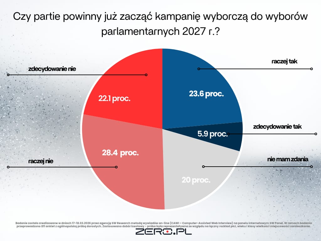 Na pytanie „Czy partie powinny już zacząć kampanię wyborczą do wyborów parlamentarnych 2027 r.?” odpowiedzi „zdecydowanie tak” udzieliło 5,9 proc. ankietowanych, a kolejne 23,6 proc. odpowiedziało „raczej tak”.