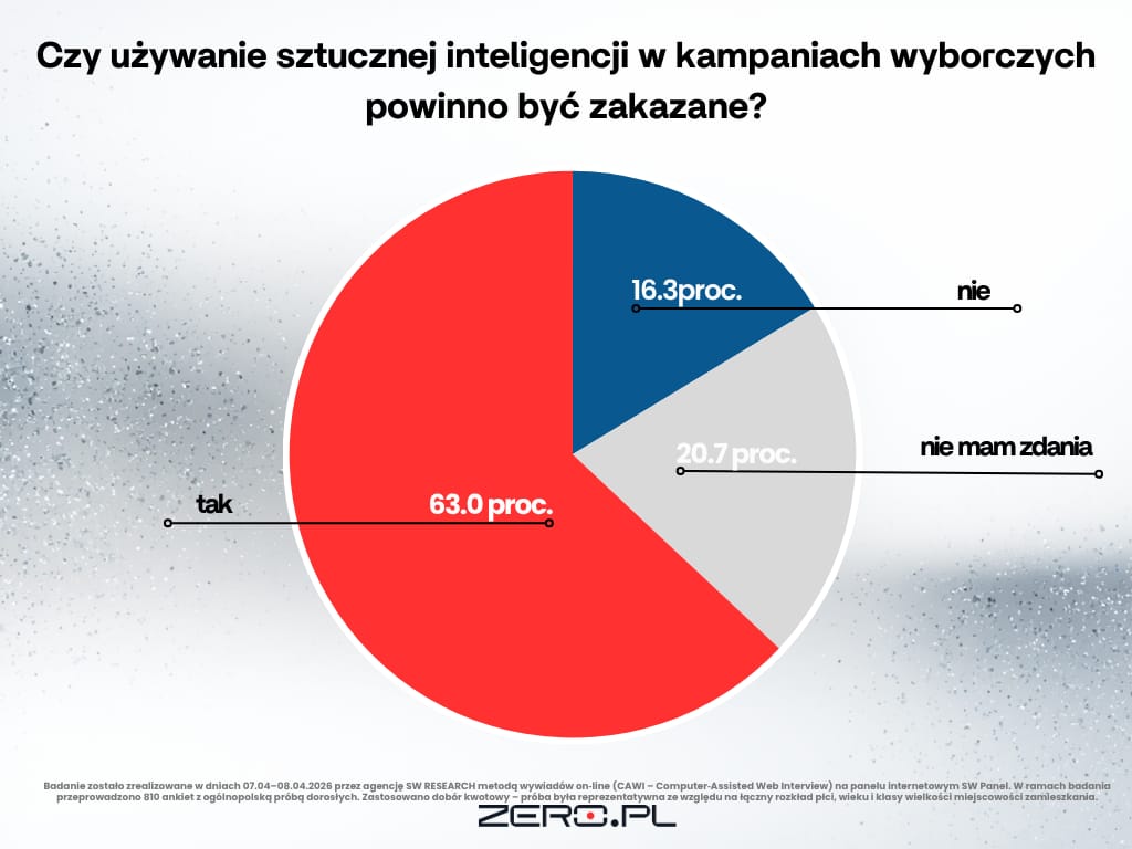 Aż 63 proc. Polaków uważa, że wykorzystywanie sztucznej inteligencji w kampaniach wyborczych powinno zostać zakazane – wynika z najnowszego sondażu SW Research przeprowadzonego dla Zero.pl. Przeciwnego zdania jest 16,3 proc. respondentów, a 20,7 proc. nie ma wyrobionej opinii w tej sprawie.