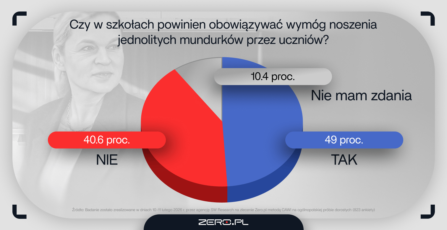 - Zgodnie z sondażem SW Research dla Zero.pl 49 proc. badanych uważa, że w szkołach powinny obowiązywać jednolite mundurki. 10,4 proc. nie ma zdania w tej sprawie.