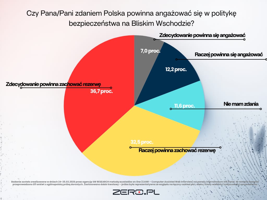 - Sondaż SW Research pokazuje wyraźną przewagę respondentów opowiadających się za powściągliwością – 69,2 proc. Polaków chce, by Polska nie angażowała się w działania na Bliskim Wschodzie.