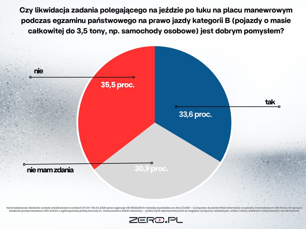 Ankietowani na pytanie o rezygnację z jazdy po łuku na placu manewrowym praktycznie podzielili się „po równo”. Według 33,6 proc. respondentów to dobra decyzja, 35,5 proc. ma zdanie przeciwne, a 30,9 proc. nie ma zdania.