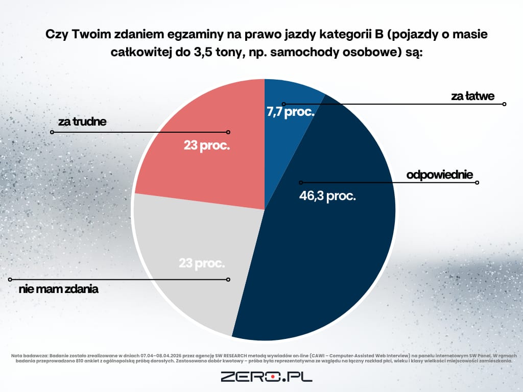 Z kolei według niemal połowy respondentów (46,3 proc.) egzaminy w obecnej formie są „odpowiednie”. Tylko 7,7 proc. ankietowanych uważa, że są za łatwe, 23 proc. twierdzi, że są za trudne, a zdania nie ma również 23 proc. ankietowanych. Co ciekawe, w grupie do 24 lat aż 63,3 proc. uważa, że są one odpowiednie. To stoi w sprzeczności z aspiracjami tej grupy do rezygnacji z jazdy po łuku.
