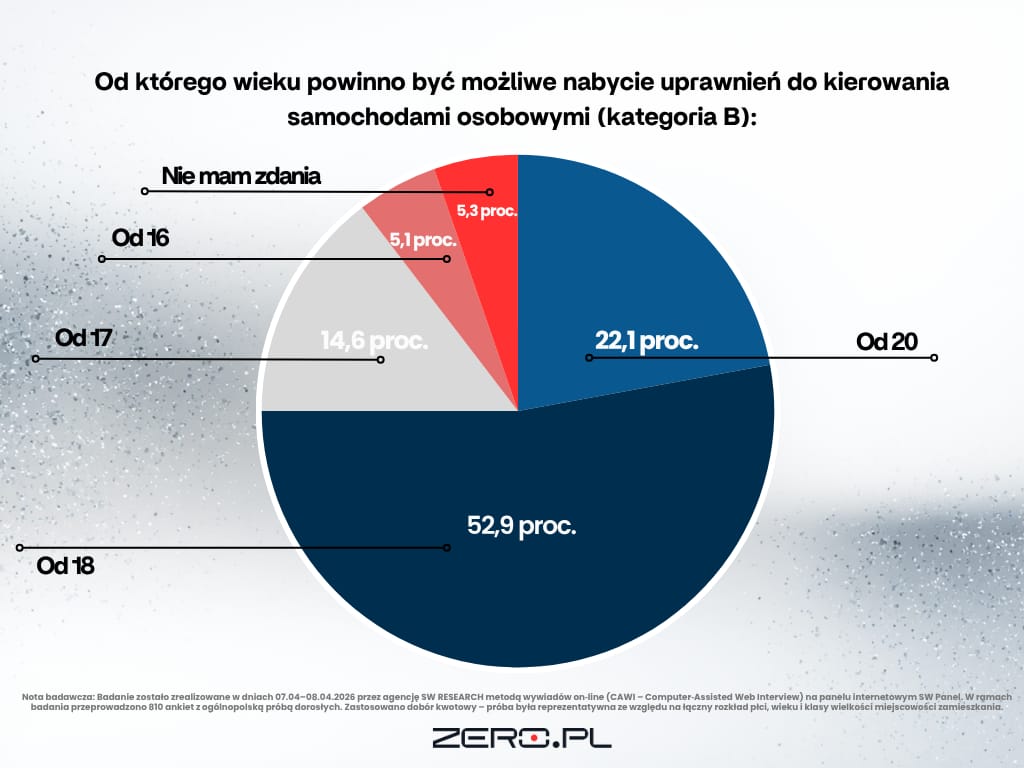 Respondenci nie widzą też powodu do zmian w kwestii wieku, od którego możliwe powinno być nabycie uprawnień do kierowania samochodami osobowymi. Ponad połowa respondentów (52,9 proc.) uważa, że 18 lat to dobry moment.
